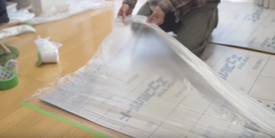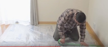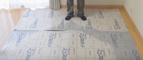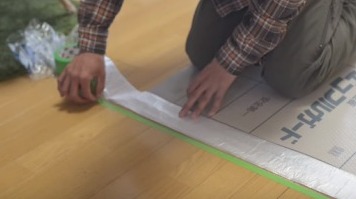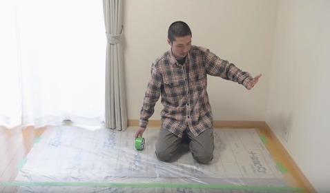 手順2、布コロナマスカーを養生板を囲うように床に貼る