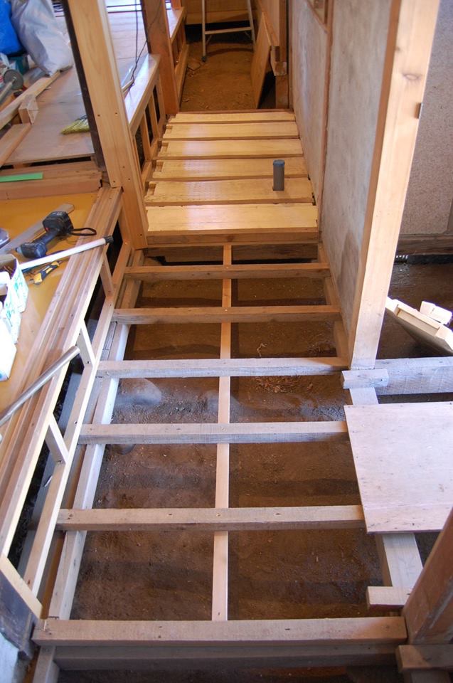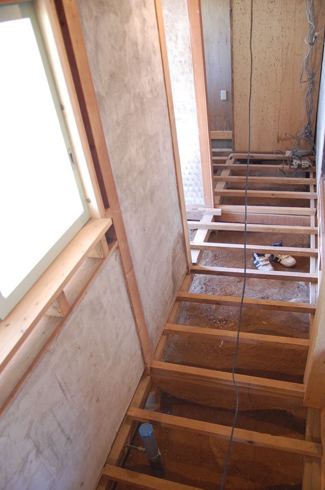 宝倉庫にあった断熱材を床に詰めて、傾いていた床を平らに整えていきます。