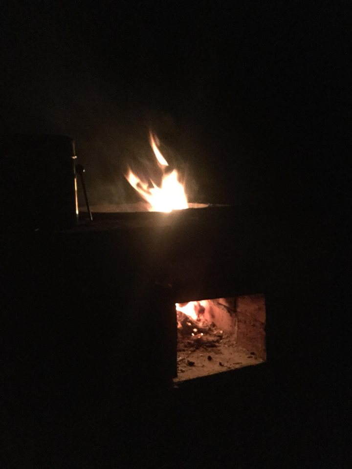 貸切り集落の絶景東屋のかまどで、夫神岳の向こう側に夕陽が沈むのをワイン片手に見送り、