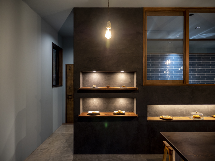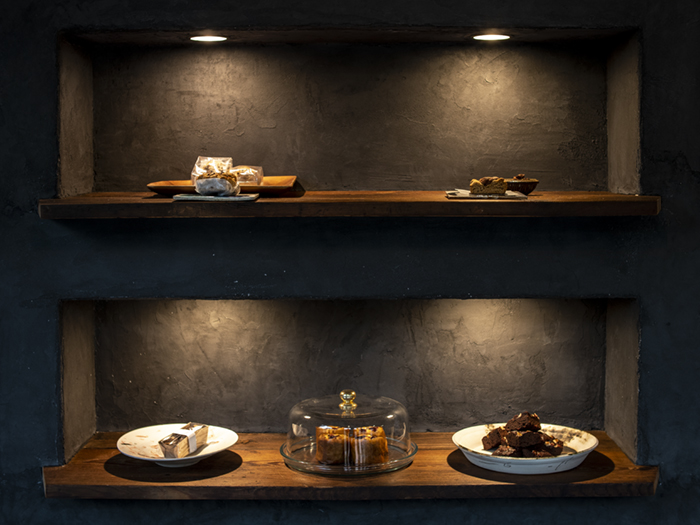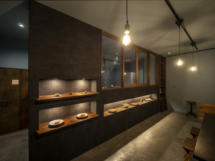 正面のおやつのディスプレイの壁にはモールテックスを塗りました。