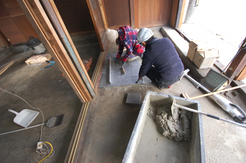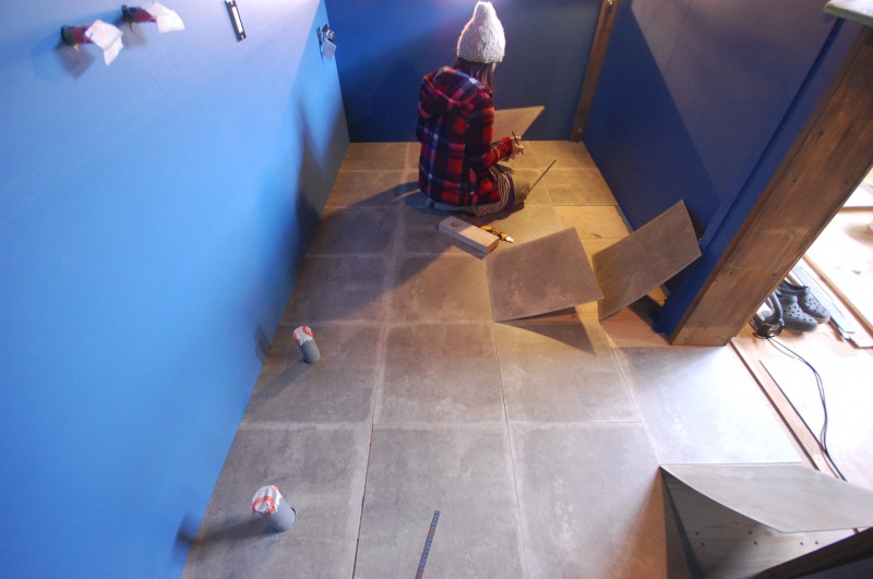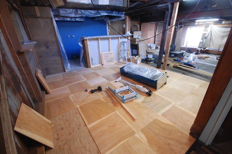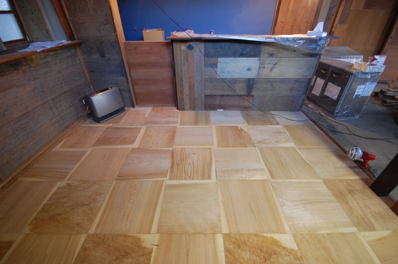 床は古材と一緒にゲットした和室の天井に使われる格天井板を使って動きを出してみました。
