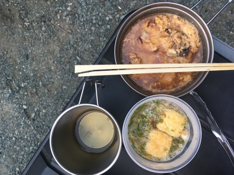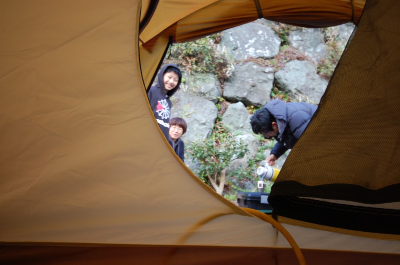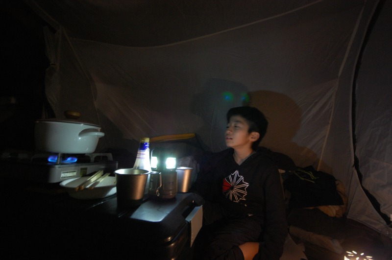 今夜はテント内で調理、食事。