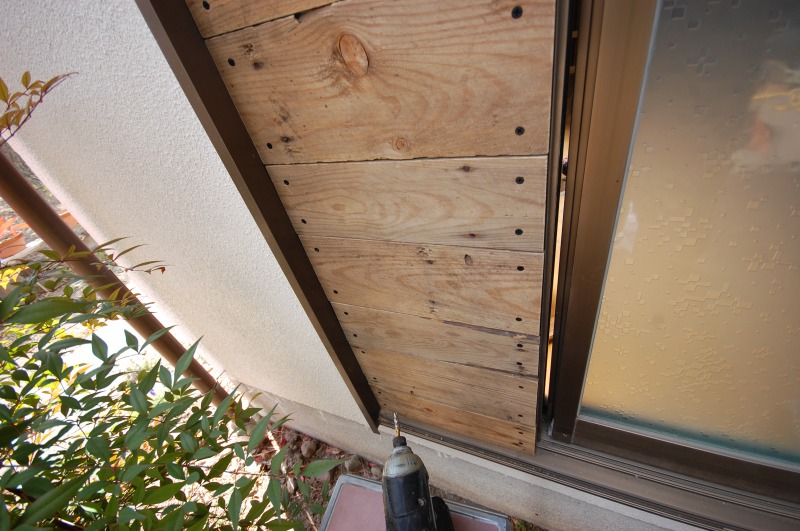 ドリルでアルミ部分に下穴をあけて、黒いビスで古材張り。