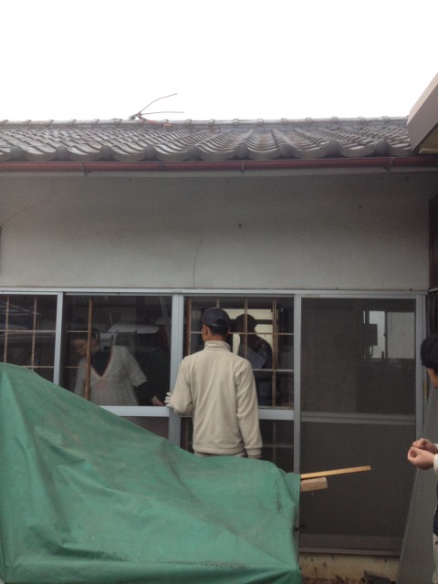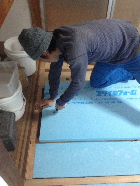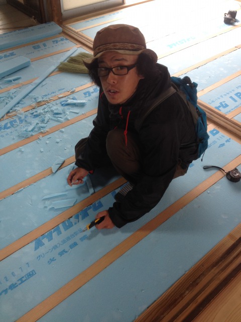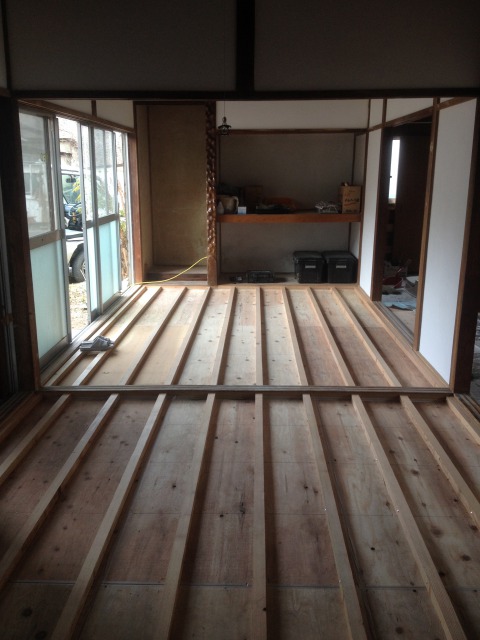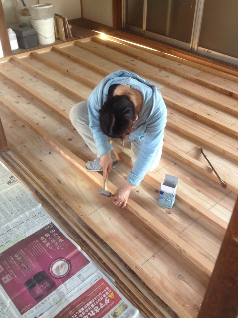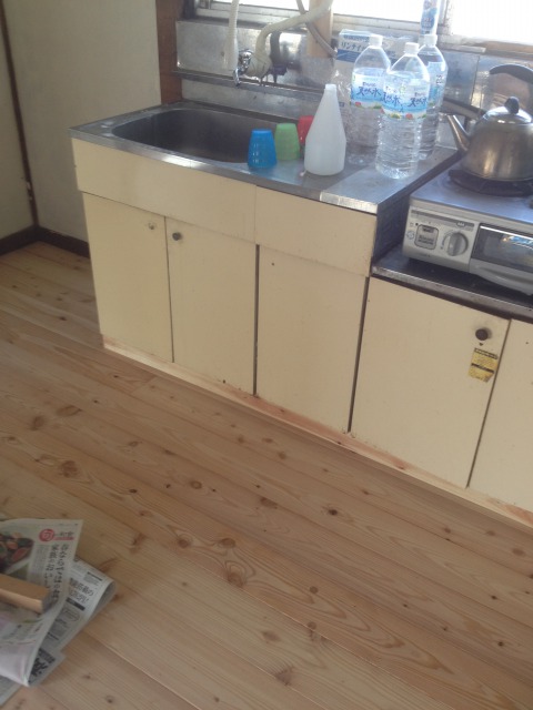 その間に日本建築 柾彦さんがキッチンの床にカラマツの無垢の床板を