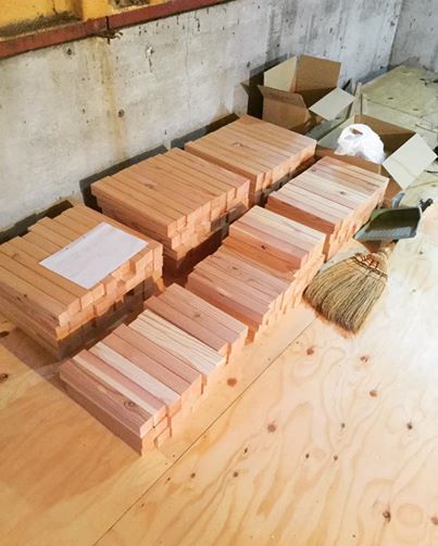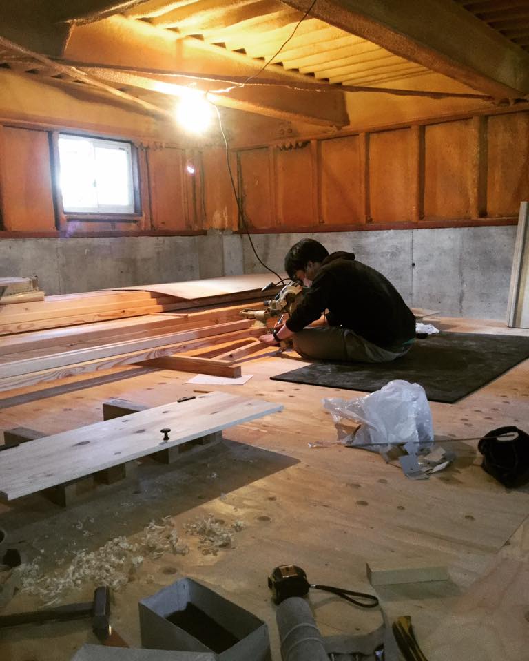 地下工房にねこのしろのフレームになる信州カラマツ。