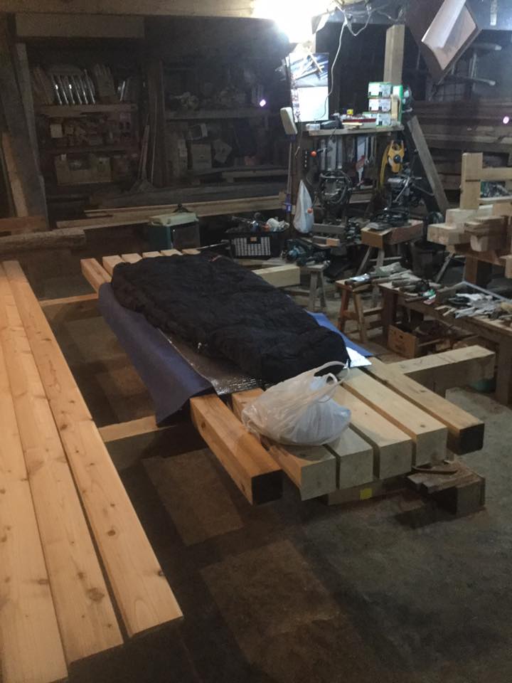 住人一人の消滅集落にてヒノキの角材ベット 2024 7/05 田舎暮らしの生活 2017/11/032024/07/05 今日は人里離れた真っ暗闇の山奥の ヒノキの角材(を並べただけの)ベットで、おやすみなさい。 呑んだくれてベロンベロンなので 寝返りして土間に落ちませんように。 おやすみなさい。 えんがわ商店の「おためしコンサルプラン」はコチラ!DIYオンラインコミュニティ「えんがわラボ」入会相談はコチラ! 田舎暮らしの生活 上田市 別所温泉 角材ベット この記事が気に入ったら いいね または フォローしてね! Follow @engawashoten Follow Me よかったらシェアしてね! URLをコピーしました! 上田市で古民家のセルフリノベーションがスタート! 畳から信州カラマツの無垢のフローリングに張替えセルフリノベ 関連記事 細胞を入れ替え、日々生まれ変わる。 2024/05/20 自分で作る、というその気持ちの在り方そのものがセルフビルド。 2024/05/09 自分で作る、自分と暮らし。 2024/05/08 軽井沢風越学園「かぜうたげ」 2023/07/29 末端冷え性の僕は夏がベストサウナ。 2023/07/13 なにかと町田市に縁がアリマス。 2023/06/12 薪割りとセルフビルドは何よりも仲間が大事。 2023/04/23 軽井沢風越学園は学校をセルフビルドしてきた。 2023/03/21