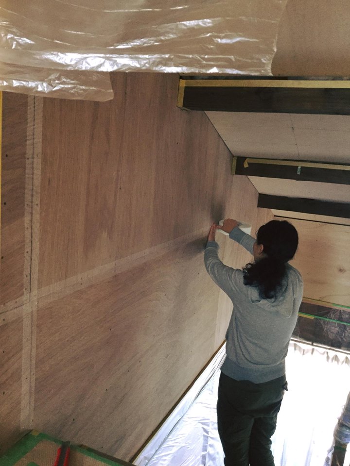 もっとも大変な吹抜け部分の天井張りと壁張りを
