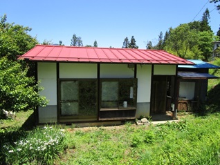 里山の景色が広がる集落の小さな赤い屋根の平屋の物件です。