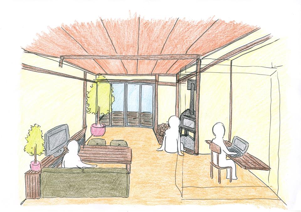 薪ストーブのスペースは一段下げてベンチを設けてくつろぎピットスペースに。