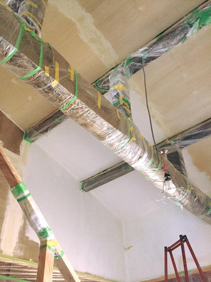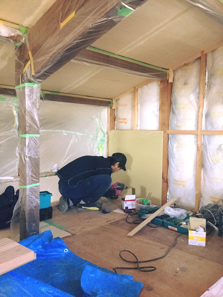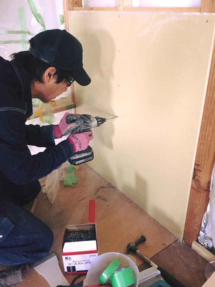 天井張りやら、壁張りやら、養生やら、パテ塗りやら…。